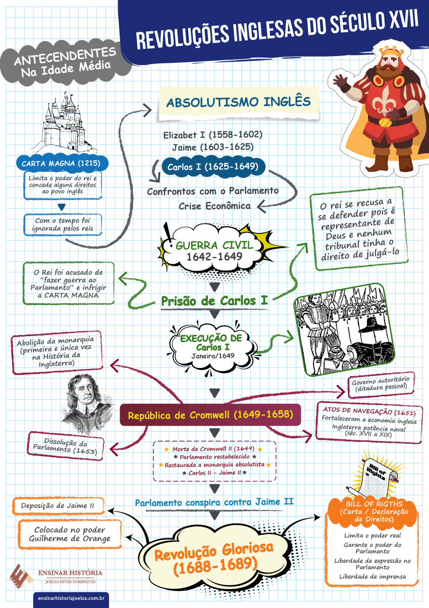 Mapa mental/Resumo das Revoluções Inglesas do Século XVII: